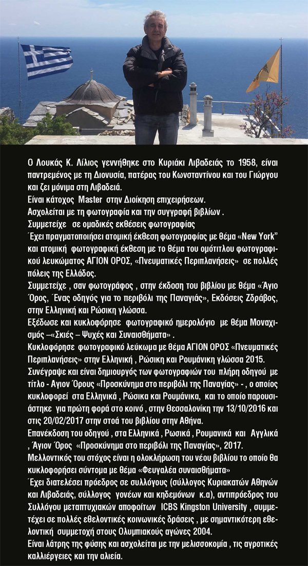 Ο Συγγραφέας και φωτογράφος κος Λουκάς Λίλιος γοητευμένος από αυτόν τον τόπο που αποτελεί το πραγματικό θησαυροφυλάκιο, το κάστρο της Ορθοδοξίας, το μυρωμένο περιβόλι της Παναγίας, το στολίδι της φύσης και της Ελλάδας ,κατέβαλε κάθε δυνατή προσπάθεια να αποτυπώσει μετά από ατέλειωτα ταξίδια, μετακινήσεις, πεζοπορίες, φωτογραφικές λήψεις και μελέτες πατερικών κειμένων και βιβλίων όλον αυτό τον θησαυρό.